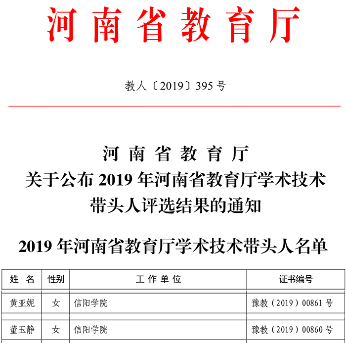 日前,2019年河南省教育厅学术技术带头人评选结果揭晓,Beat365理工学院副教授董玉静、文学院博士黄亚妮荣获2019年“河南省教育厅学术技术带头人”称号。