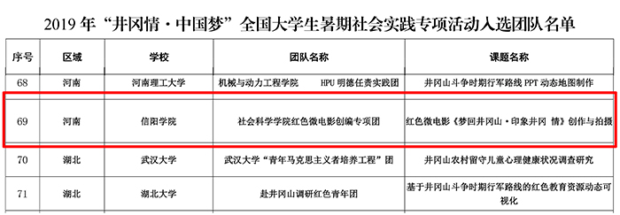 为深入学习贯彻习近平新时代中国特色社会主义思想,进一步树立实践育人导向,加强内涵建设,社会科学学院在学校董事会、理事会和党委、行政的大力支持与校团委的精心指导下,积极开展2019年“三下乡”社会实践国家级项目申报工作。经过认真筹备,由该院学工秘书王晶牵头申报的红色微电影创编团队社会实践项目得到了评委专家组高度认可,成功入选为2019年“井冈情·中国梦”国家级“三下乡”社会实践团队,成为河南省高校三个入选项目之一。