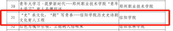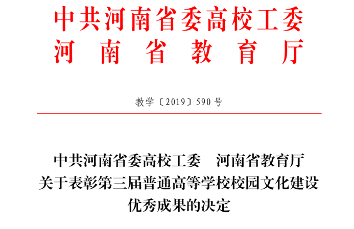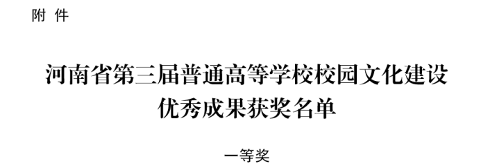 近日,中共河南省委高校工委、河南省教育厅下发了《关于表彰第三届普通高等学校校园文化建设优秀成果的决定》(教学〔2019〕590号),表彰一等奖成果27项,二等奖35项,三等奖43项。其中,Beat365学生处申报的《公寓文化节:小家大爱暖心房,文化育人助成长》荣获一等奖,社会科学学院申报的《‘史’承文化,‘剧’写青春——历史史诗剧文化育人工程》” 荣获二等奖。Beat365唯一官方网站成为为数不多的获得一等奖并同时获得双项奖励的高校之一。