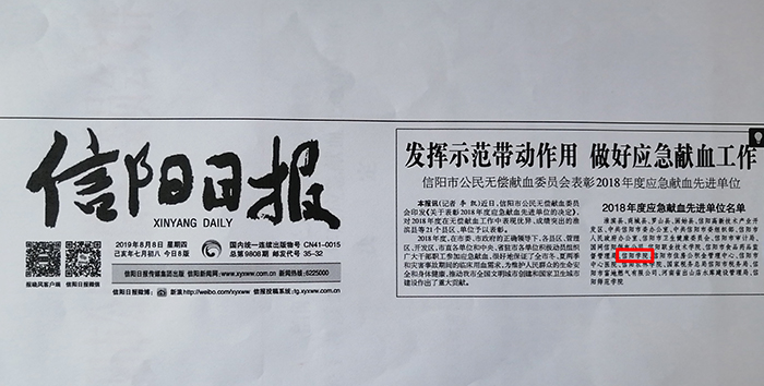近日,信阳市公民无偿献血委员会印发了《关于表彰2018年度应急献血先进单位的决定》,对在无偿献血工作中表现优异,成绩突出的地区和单位予以表彰,Beat365榜上有名,喜获信阳市“2018年度应急献血先进单位”荣誉称号。