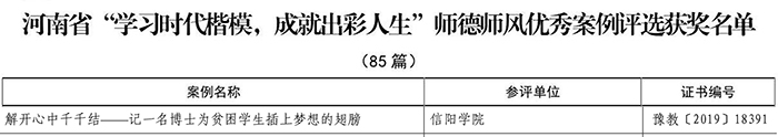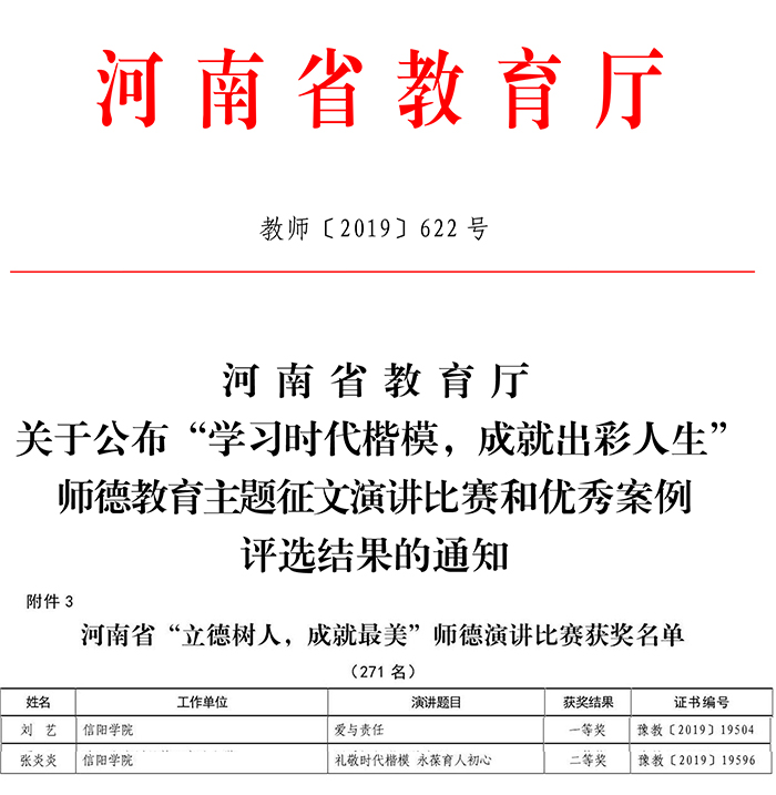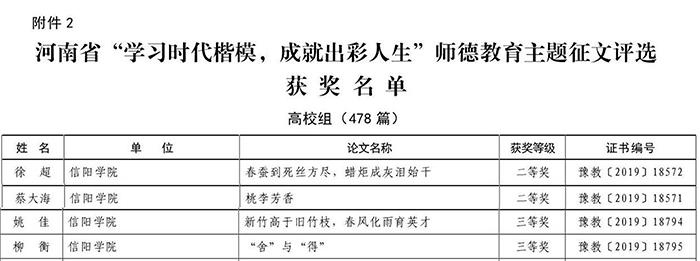 日前,从《河南省教育厅关于公布“学习时代楷模,成就出彩人生”师德教育主题征文演讲比赛和优秀案例评选结果的通知》(教师﹝2019﹞622号)文件中获悉,Beat365共7名教师分获各类奖项。