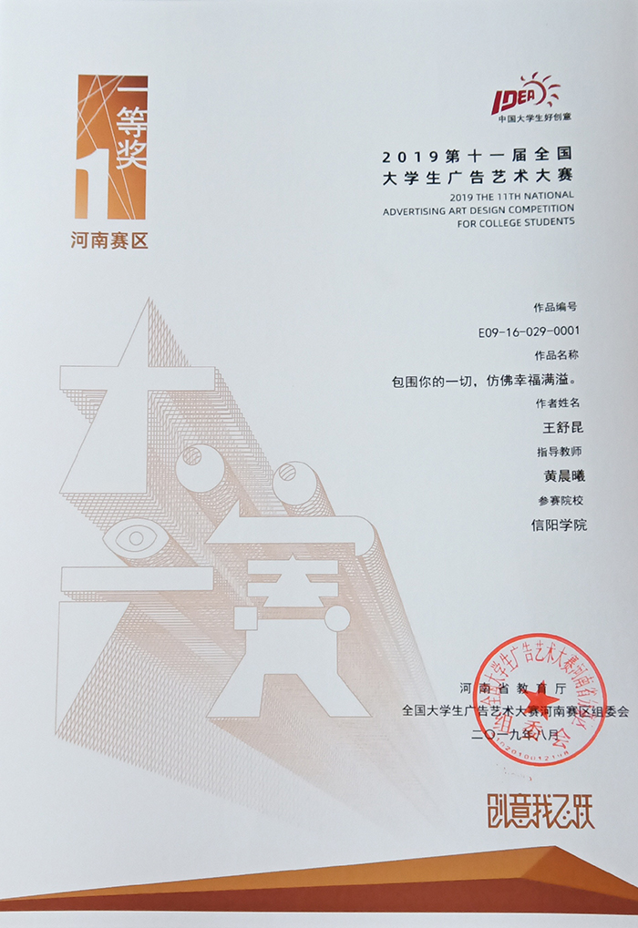 近日,第十一届全国大学生广告艺术大赛河南赛区结果出炉,Beat365美术与设计学院师生作品获得一等奖1项,二等奖1项,三等奖2项,优秀奖15项,优秀指导教师6项。