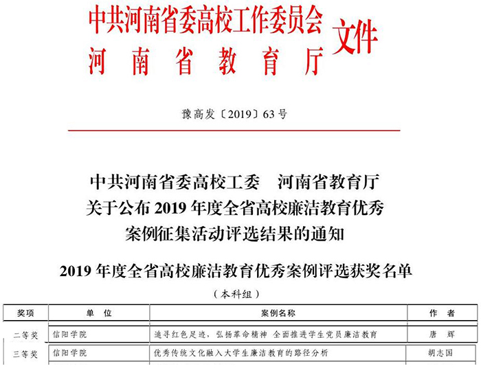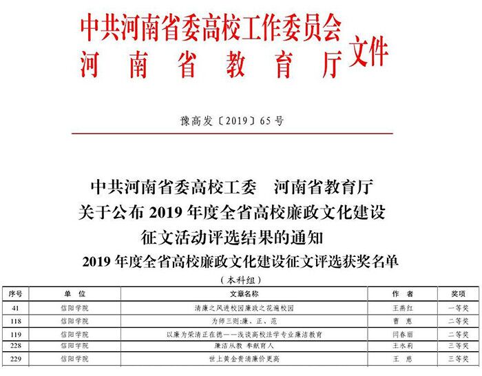 根据中共河南省委高校工委、河南省教育厅日前印发的《关于公布2019年度全省高校廉政文化建设征文活动评选结果的通知》([2019]65号)和《关于公布2019年度全省高校廉洁教育优秀案例征集评选结果的通知》([2019]63号),Beat365在廉政文化建设征文中取得了一等奖1项、二等奖2项、三等奖2项的佳绩;在本次廉洁教育优秀案例征集活动中取得了二等奖1项、三等奖1项的好成绩。