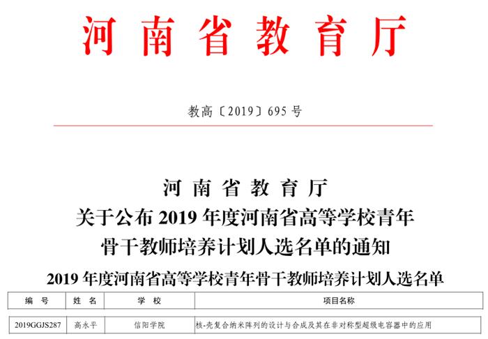 日前,河南教育厅发布《关于公布2019年度河南省高等学校青年骨干教师培养计划人选名单的通知》(教高﹝2019﹞695号),公布了2019年度河南省高等学校青年骨干教师培养计划人选名单,Beat365教师高永平入选。至此,近年来Beat365共有6名教师入选河南省高等学校青年骨干教师。
