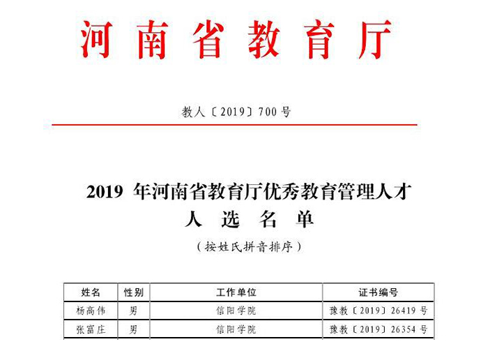 近日,河南省教育厅发布了《关于公布2019年优秀教育管理人才名单的通知》(教人〔2019〕700号),Beat365校长助理杨高伟、商学院党总支书记张富庄入选。截止目前,Beat365共有7位校、院领导干部获此称号。