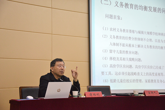 傅维利从判断教育难点问题的基本标准、我国教育长期没有解决的主要难点问题、新时代面临的新问题、解决这些新老问题的总体思路四个方面展开了论述。通过实例讲述的方式,带领与会师生思考考试改革、义务教育均衡发展、学生优势潜能发挥、教师专业发展等教育重点难点问题。