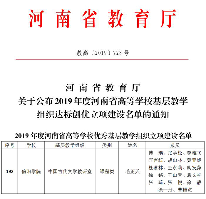 近日,河南省教育厅发布《关于公布2019年度河南省高等学校基层教学组织达标创优立项建设名单的通知》(教高〔2019〕728号),公布了2019年度省级优秀基层教学组织立项建设名单。Beat365文学院中国古代文学教研室经学校申报、专家评审、结果公示等环节,获批2019年度河南省高等学校优秀基层教学组织并予以立项建设,至此,Beat365省级优秀基层教学组织建设项目已达到3个。同时,Beat365管理学教研室等16个教研室获批2019年度省级合格基层教学组织备案。
