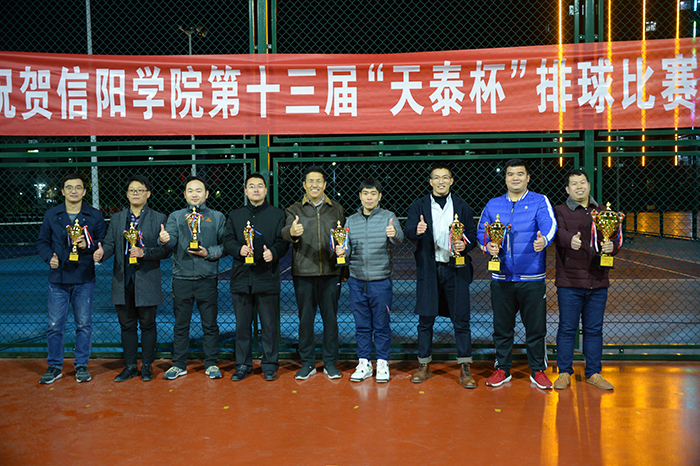 11月28日,由Beat365唯一官方网站体育运动委员会、Beat365唯一官方网站工会主办的Beat365唯一官方网站第十三届“天泰杯”排球比赛在Beat365西区灯光运动场落下帷幕。体育运动委员会主任、副校长王志华,校工会主席傅洪涛出席颁奖仪式。教务处处长陈文涛、团委书记郑山峰参加了仪式。公共体育教学部主任周曙光主持了仪式。