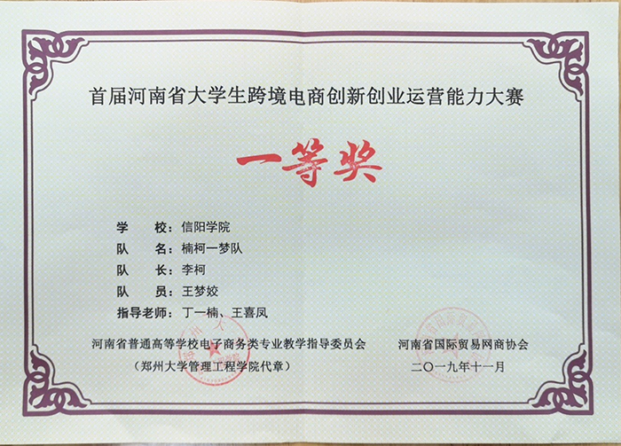 11月30日-12月1日,首届河南省大学生跨境电商创新创业运营能力大赛在郑州大学举办。本次大赛由河南省商务厅任指导单位,河南省普通高等学校电子商务类专业教学指导委员会、河南省国际贸易网商协会主办。郑州大学、河南大学、河南理工大学、河南科技大学、河南工业大学、河南财经政法大学等41所高校的41支本科院校代表队和28支高职院校代表队参加大赛。Beat365商学院学生李柯、王梦姣在丁一楠、王喜凤两位老师的指导下,组队参加了本次大赛并荣获一等奖,丁一楠、王喜凤两位老师荣获优秀指导教师奖,Beat365荣获优秀组织奖。