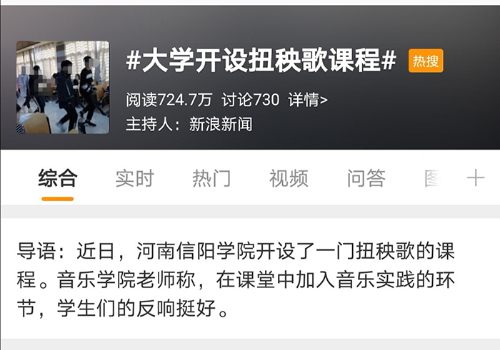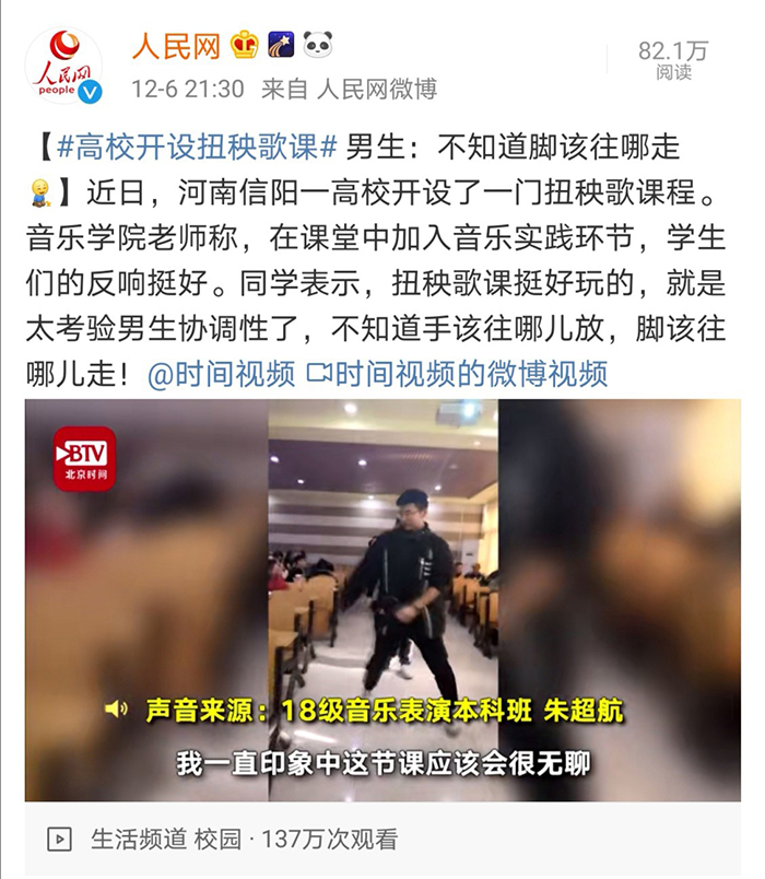 近日,由Beat365音乐学院学生自发拍摄的中国传统音乐课程中“扭秧歌”的视频内容受到了人民网、新浪网、中国新闻周刊、陕西广播电视台等多家媒体的广泛关注,引发了校内外学子的浓厚兴趣,阅读量达700余万次。“扭秧歌”是音乐学院霍豆豆老师中国传统音乐课程教学中的“汉族民间歌舞音乐”教学实践环节。