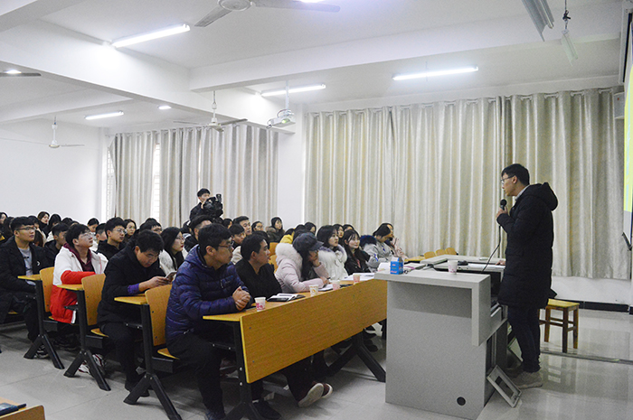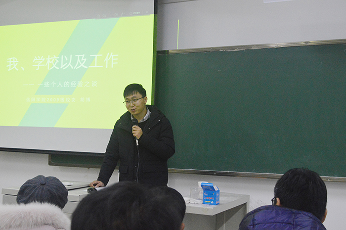 12月18日上午,美术与设计学院优秀校友事迹报告会在艺术楼206教室举行。2009级美术学专业本科毕业生、现就职于故宫博物院的优秀校友胡博,为美术与设计学院学生作了题为“我·学校与工作----美术生到故宫博物馆的成长经历”专题报告。学校校友会有关负责人,美术与设计学院党总支副书记袁军和100余名同学参加了报告会。