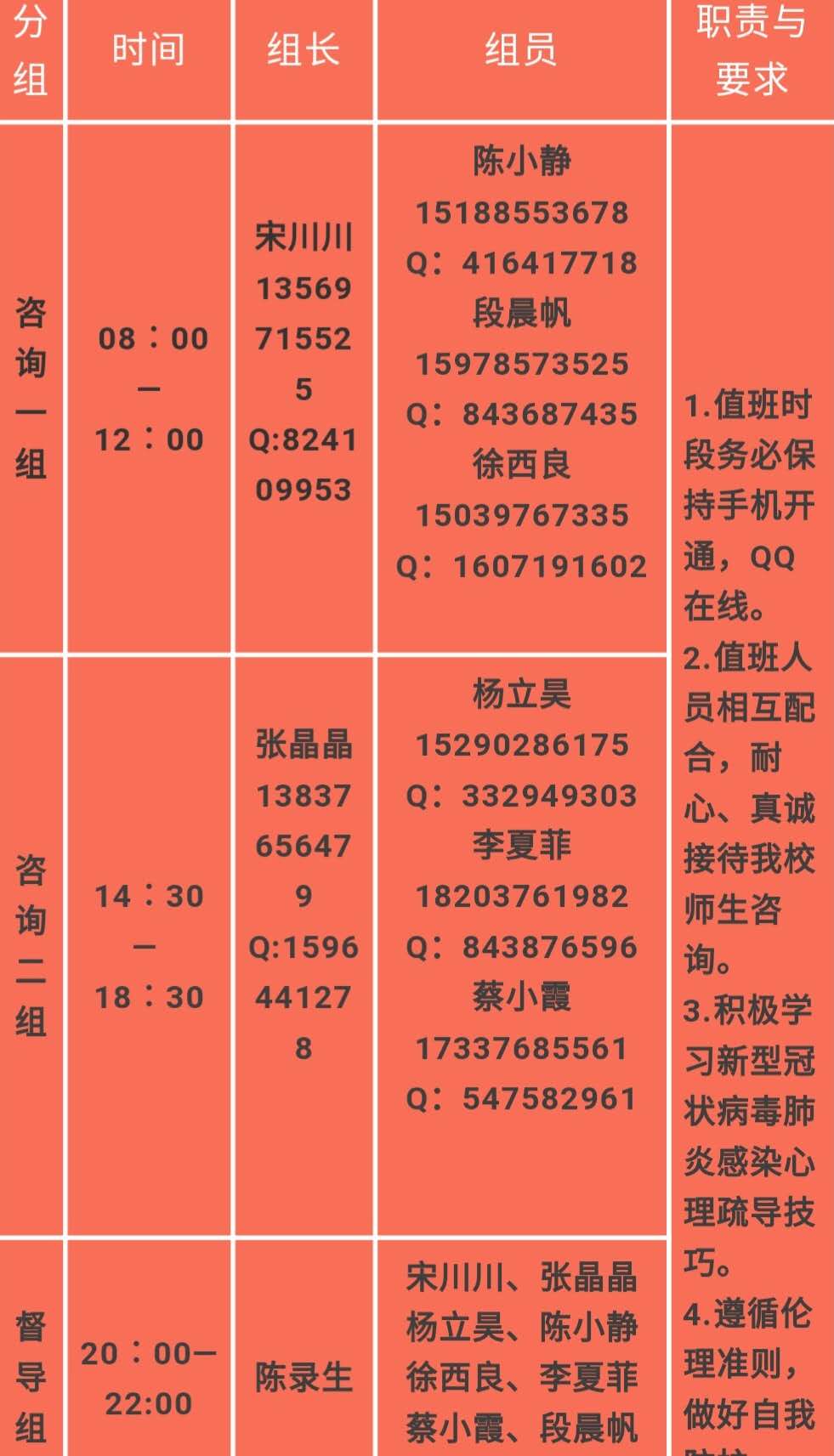 组织有丰富经验的心理咨询师,开通心理咨询服务热线,全天候坚持值班,由专职教师流担任值班组长,组织6位心理学教师,坚持为由疫情引起焦虑、恐慌、担忧等身心不适症状的师生提供心理疏导服务。心理咨询服务热线报省教育厅和市文明办予以公示,为社会民众提供心理咨询服务,并坚持做好每天上报备案工作。
