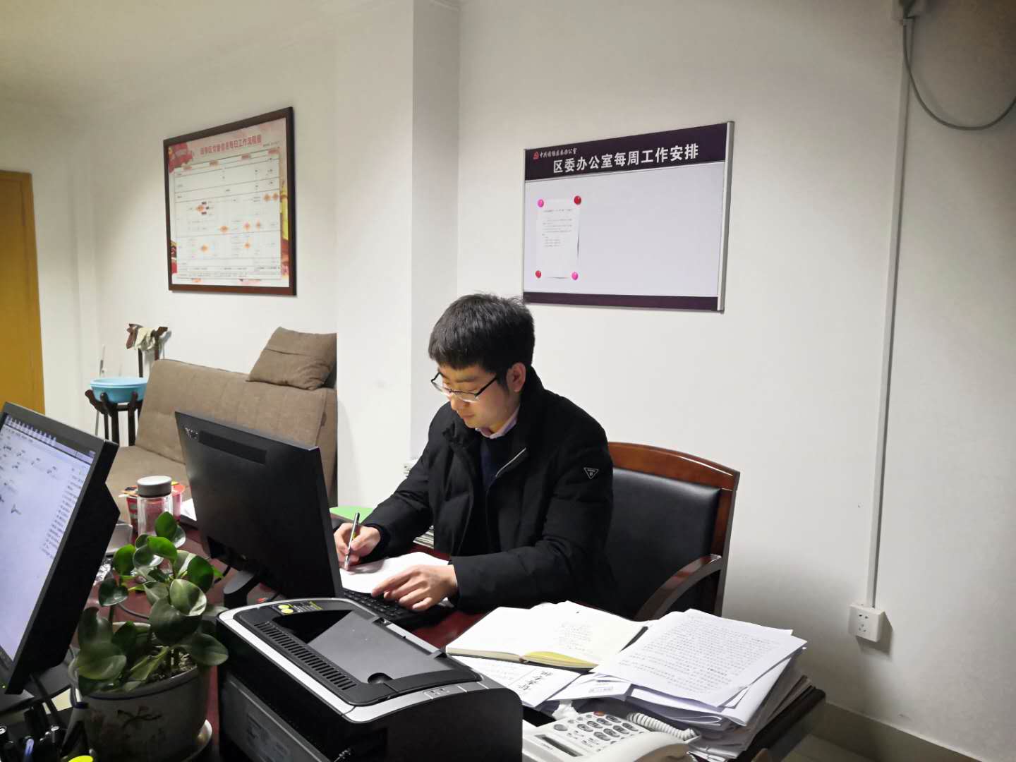 疫情防控阻击战打响后,原本在家乡休假的他,主动放弃休息时间,从远在千里之外的河南老家迅速返回工作岗位。由于交通不便,为了不耽误工作,他的家人奔波一千余里,从信阳老家开车将他送往工作地宿迁市。一到单位,他就立刻参与到区防控办督查专报和疫情动态的编写工作中。他白天跑乡镇、卡口、企业督查防控工作,晚上加班加点把发现的问题和建议梳理出来,第一时间呈报给区委领导。疫情防控时间紧、任务重,他经常熬夜到凌晨一两点钟,从大年初四回到工作岗位到现在没有休息一天。他参与撰写的疫情防控督查专报得到区委主要领导的批示,有力推动了防控工作扎实开展。截至目前,他所在的宿豫区暂无一例确诊和疑似病例。