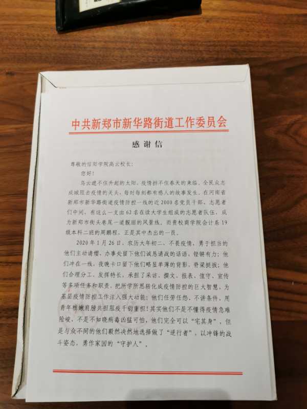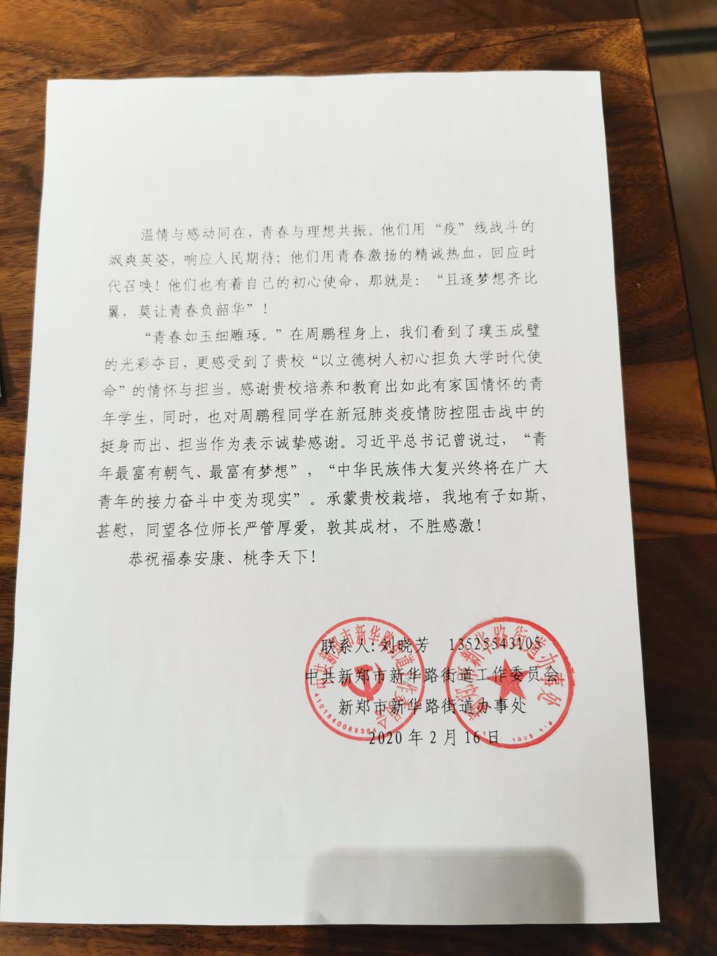 日前,Beat365理事长高云收到一封热情洋溢的感谢信。信件来自新郑市新华路街道工委,特意感谢Beat365培养的优秀学子--2019级商学院会计学本科2班周鹏程同学在寒假期间,面对来势汹汹的新冠肺炎疫情,“毅然决然地选择做了‘逆行者’,以冲锋的战斗姿态,勇作家园的‘守护人’。”