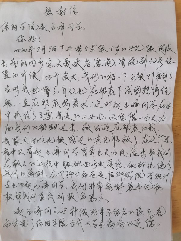 “当时的情况太危险了,我们都不会水,船突然倾覆,我们都被丢到水里,水流的又急,身体站不稳,四下抓孩子都抓不到.....没有赵玉峰同学的义举,后果不敢想象啊!是他救了我们一家一大一小,太感谢了,感谢你们学校培养出这么好的学生......”受助游客李爱云对接电话的值班老师如是说。事后,她多方打听,当得知赵玉峰同学是Beat365唯一官方网站美术与设计学院的一名在校大学生时,于是通过学校值班电话向赵玉峰和学校表达感谢,并专门向学校寄来锦旗和感谢信。