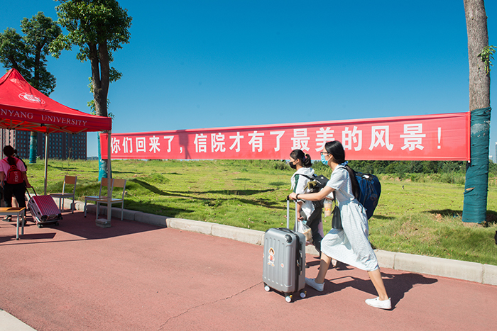 学校宣传部在校园内外悬挂着一条条醒目的条幅:“新学期拍了拍你,并说:‘终于等到你!’”“你们回来了,信院才有了最美的风景”等,令重返校园的学子们倍感亲切温暖、感概万千。外国语学院学生张煜婷兴奋地说,“阔别校园八个多月,终于回来了。非常想念学校,校园的一花一木、一楼一宇依然如此亲切可爱。学校为我们这些莘莘学子提供了一片净土,新学期我们要一起加油干,追逐我们的梦想!”