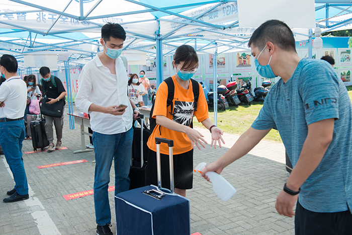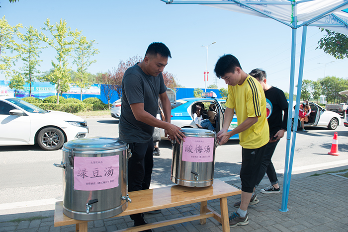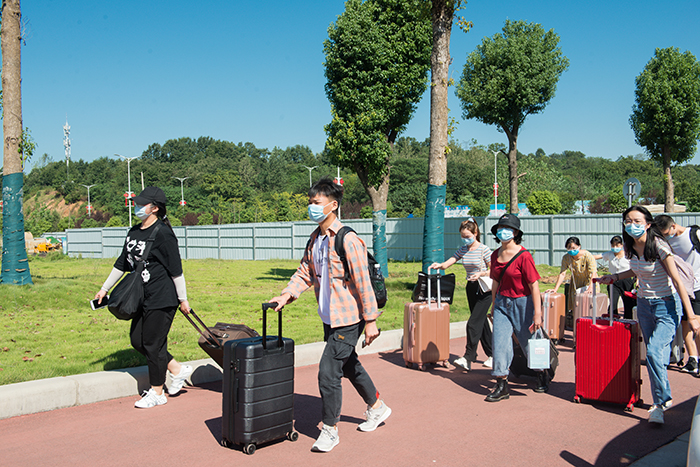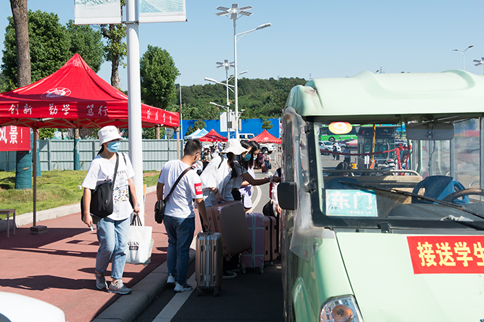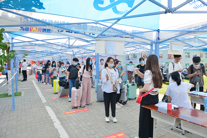 报到现场,同学们在学生处、保卫处、校医院等部门和各学院工作人员指引下,严格按照学校疫情防控相关要求,佩戴口罩、间隔排队、自觉测温、出示平安入校通行码、消毒杀菌、领取校园通行证,从专用通道有序入校。学校资产处在校门口准备了清热解暑的绿豆汤和酸梅汁供同学们饮用,校办、后勤处贴心安排了校园通勤车帮助同学们运送行李。