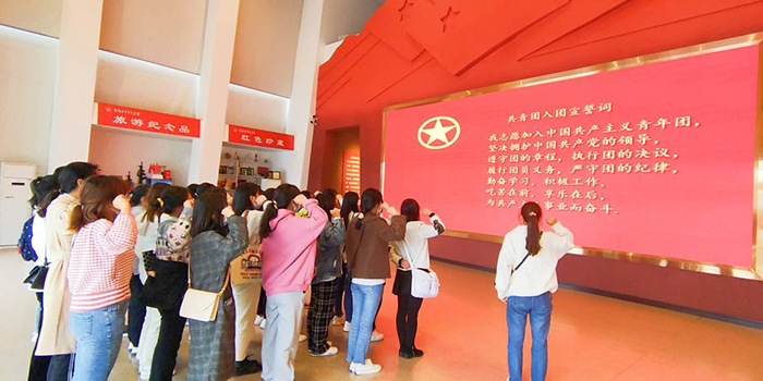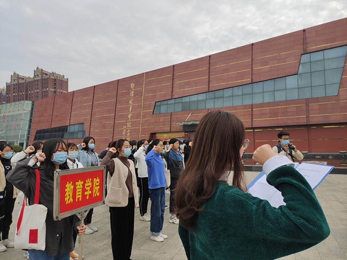 11月3日,在团总支书记周余瑞带领下,教育学院师生代表前往鄂豫皖革命纪念馆参观学习,开展主题团日活动,深入了解中国共产党艰苦卓绝的伟大奋斗历程,缅怀抗美援朝英烈的丰功伟绩。活动开始之前,学院师生代表在纪念馆前重温入团誓词,齐唱国歌、团歌,全体肃立为革命先烈默哀。接着,大家参观了鄂豫皖革命纪念馆,接受革命传统教育。