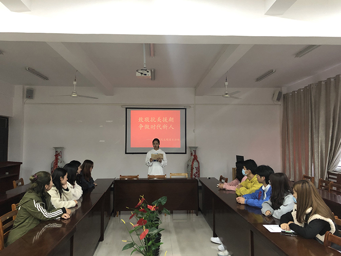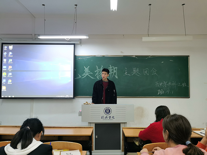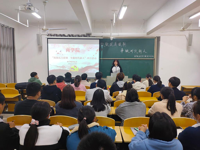 11月1日,社会科学学院组织2020级、2019级各班开展“抗美援朝”主题团课活动,进一步发挥学校红色教育主战场、立德树人大课堂的作用,为爱国教育凝聚力量。在团课上,各班团支书带领全班同学齐唱国歌、团歌,表达爱国之情。各班在团课中设置了演讲环节,观看了抗美援朝有关视频,充分发挥其教育意义,引发大家的共鸣。学院志愿服务队参观了鄂豫皖革命纪念馆,深入体验红色文化,重温红色革命历史。