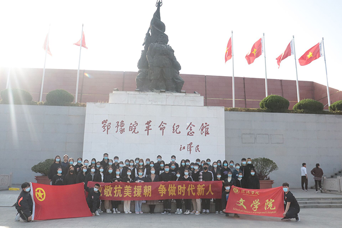 11月10日,文学院团总支书记胡若扬带领团员代表,在鄂豫皖革命纪念馆组织开展主题团日活动,共同追忆峥嵘岁月,缅怀革命先烈。2020级新生团支书代表张晨宵领唱团歌。新生团员代表冯宇靖以“发扬抗美援朝精神,彰显时代价值”为题作了演讲,激励了全体团员不忘初心、砥砺前行。团总支副书记李瑞晓向全体团员讲授微团课。