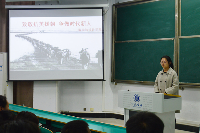 10月30日,数学与统计学院在数计楼105教室开展了主题团日活动。学工干事田媛、团总支书记白智然和全体共青团员参加会议。田媛作主题报告,讲述了抗美援朝精神的时代价值和赢得胜利的制度优势、政治优势和精神优势等,引导同学们增强斗争精神、奋斗精神。团员代表沈政昊同学以“致敬抗美援朝,争做时代新人”为主题,结合个人的学习经历作了心得分享。