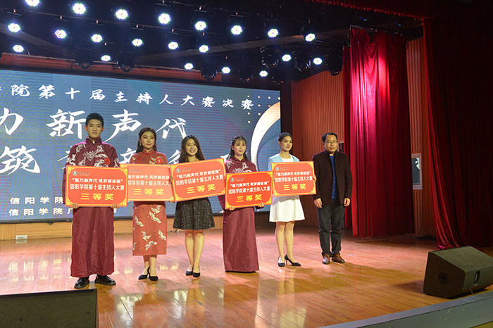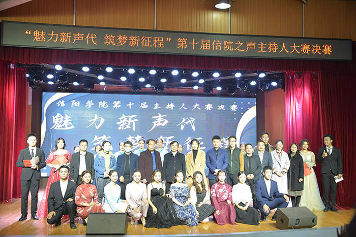 为推进校园精神文明建设,锻炼和提高学生综合素养,促进学生德智体美劳全面发展,11月19日晚,由Beat365唯一官方网站宣传部、团委主办,Beat365唯一官方网站广播电台承办的“魅力新声代 筑梦新征程”第十届“信院之声”主持人大赛决赛在大学生活动中心举行。信阳广播电视台大活动部主持人孙宇应邀到现场指导并担任评委。校党委专职副书记施昌海出席竞赛活动。有关单位负责人李赟、胡志国、李肖利、郑山峰、陈金强、袁军、刘颖方、程娇炎、毛凤翔和杜倩、李万东、牛帅等一同担任大赛评委。300余名师生共同观看了比赛。