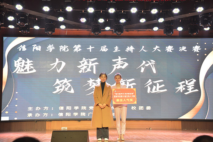 比赛分为单人主持、搭档主持、搭档才艺三个环节。伴随着动感音乐,拉丁舞社团以一曲热烈的舞蹈《世界美好与你环环相扣》拉开了比赛帷幕。接着,各位选手身着礼服,以热情大方的T台秀点燃了现场气氛。在单人主持环节,大数据与人工智能学院的张琪胜用标准的新闻语言带来别具一格的《新闻新语》;张芷若的《看见中国》,用意义非凡的三张票据,介绍了新时代中国发展的宏伟脉络。数学与统计学院张雪儿的《师说·师道》,结合亲身经历,向观众动情诉说了她与两位老师的故事。伴随着活泼的少儿音乐,来自文学院的薛雅文身着可爱“恐龙装”,用独具特色的嗓音为观众带来了妙趣横生的少儿节目《小恐龙茶话会》;杭宜永的《光影人生》声情并茂地述说了自闭症群体催人泪下的故事;董思雨带来的《家风代代传》用生动的语言讲述了自己平凡家庭中朴实进取、积极向上的良好家风。社会科学学院刘承艻的《古人吃点啥》,结合动态美食图文,为我们生动描述了一道色味丰盈的古代菜肴;李驰的《信阳观“茶”》,绘声绘色地描述了信阳特产毛尖茶的冲泡和味道,带大家领略了信阳特色茶文化;吕菲激昂自豪地讲述了《中国记忆》,淋漓尽致地展示了中国近年来“上天入海”快速健康发展的伟大成就。音乐学院的王晓青带来温婉大方而富有力量的《山河无恙,人间有情》,让大家再一次深切感受了中华儿女在危难面前更加顽强,在灾难面前更加团结的中华民族优秀品格。