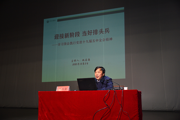 施昌海以《迎接新阶段,当好排头兵——学习领会践行党的十九届五中全会精神》为题,从全会召开重大意义、“十三五”发展成就、“十四五”奋斗目标、新百年青年学生责任与使命等方面,为培训班作了专题辅导报告。他指出,党的十九届五中全会是在世界百年未有之大变局加剧演变紧要关头和党的两个百年历史交汇点关键时刻召开的,具有重大全局性和历史性意义。全会审议通过的《中共中央关于制定国民经济和社会发展第十四个五年规划和二〇三五年远景目标的建议》,是党中央站高谋远的重大战略决策,为中华民族面向党的新百年发展振兴擘画了宏伟蓝图。