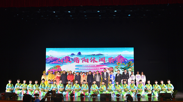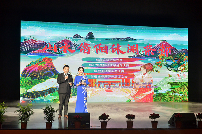 活动开始前,与会领导嘉宾热情参观了信阳十佳伴手礼,对精致丰富、富集信阳特色的产品赞不绝口。活动在充满信阳特色的开场歌舞《情满茶乡》中拉开序幕,先后展现了信阳冬季旅游产品发布会,歌伴舞《美在九镇十八湾》、女声独唱《桃花开·好运来》、RAP歌曲《说唱信阳》等精彩上演。歌舞表演与网红达人的短视频创作分享,以及信阳旅游精品线路设计大赛、“老家河南 最美信阳”首届十佳伴手礼大赛和2020信阳文旅创作大赛颁奖典礼环节互相结合,整场活动节奏紧凑,高潮迭起,赢得在场观众阵阵掌声。