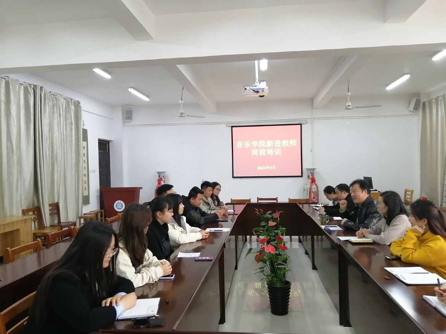 3月28日上午,音乐学院在艺术楼215会议室组织了2021年新任教师岗前培训开班仪式。学院领导班子出席开班仪式。首先,每位新任教师分别进行了简短而精彩的自我介绍,增进了彼此的认识和了解。