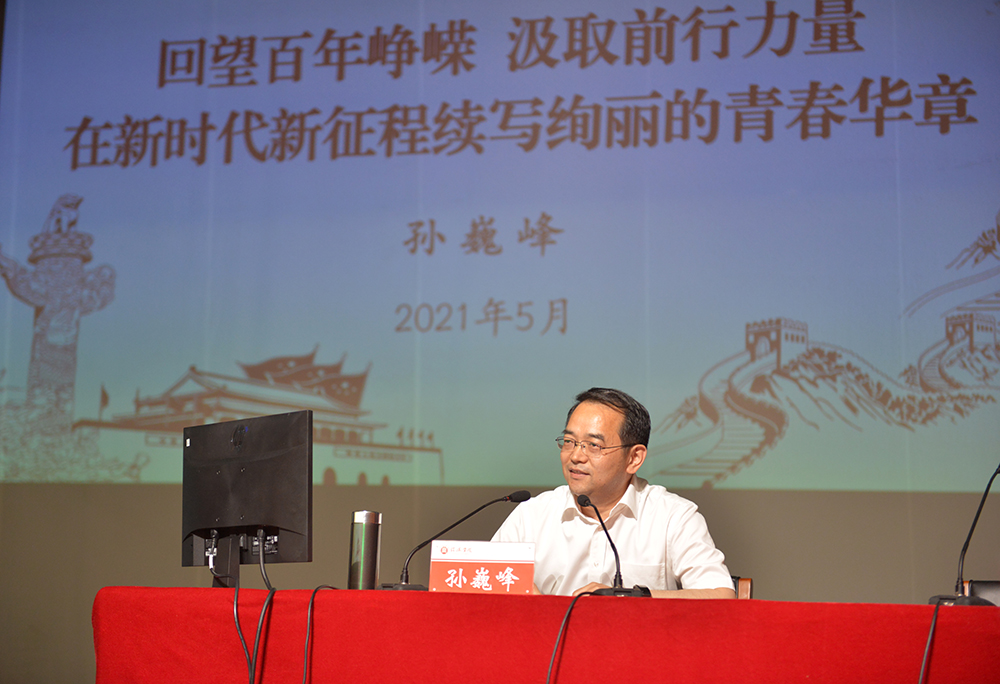 孙巍峰从“以史增信,砥砺民族复兴之志”“以史铸魂,提振奋勇前行之力”“以史鉴今,找寻攻坚克难之匙”“以史力行,坚定担当作为之责”四个方面全面阐述了中国共产党百年奋斗历史性贡献和党史学习教育的重大意义,阐释了新时代青年师生的使命担当。他指出,在“两个一百年”奋斗目标历史交汇的关键节点,以习近平同志为核心的党中央决定在全党开展党史学习教育,是立足党的百年历史新起点、统筹中华民族伟大复兴战略全局和世界百年未有之大变局、为动员全党全国满怀信心投身全面建设社会主义现代化国家而作出的一项重大决策。我们要提高思想认识和政治站位,认真落实党中央部署要求,不断增强“听党话、跟党走”、办好人民满意大学的行动自觉。