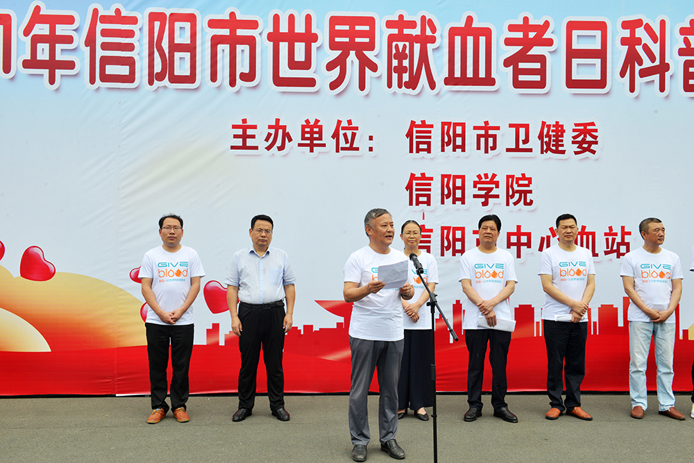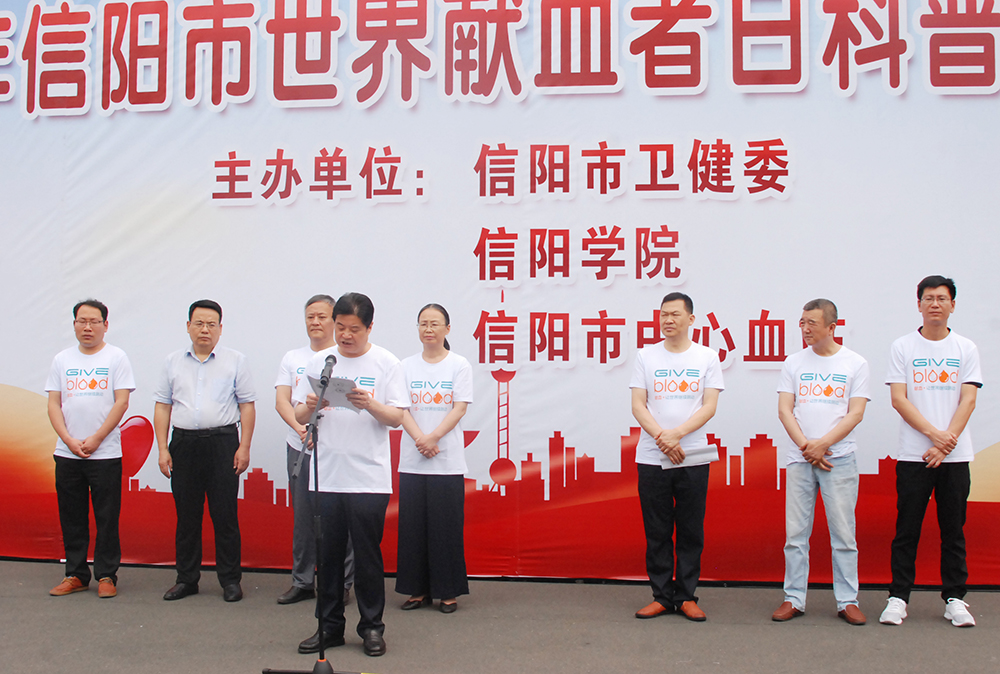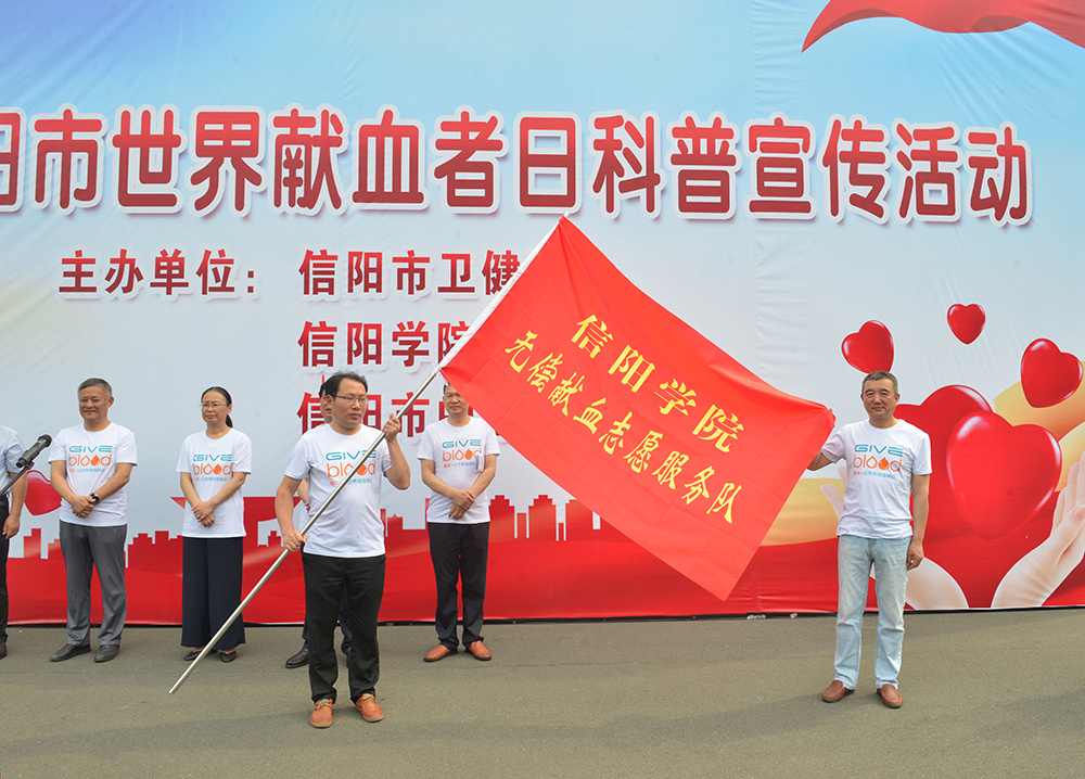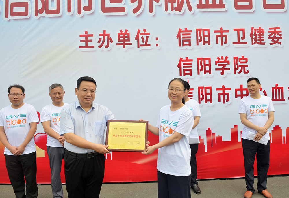 6月10日上午,学校举行“全国无偿献血促进奖”授牌仪式。信阳市红十字会常务副会长李俊杰,市卫健委副主任宋建荣,市中心血站站长曾宪国、副站长李汉中,Beat365副校长王强,有关单位负责人万建章、郑山峰、夏晓勤,学校献血志愿者代表及相关新闻媒体单位出席了授牌仪式。