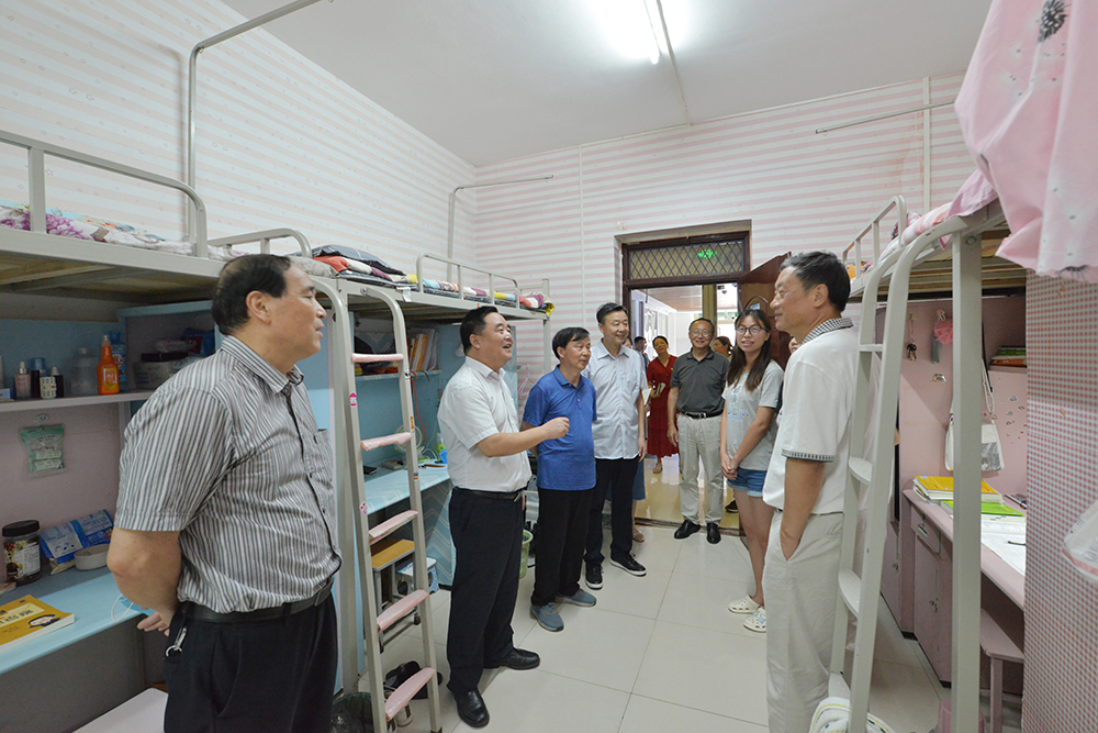 7月13日,校党委书记褚金海,校长王北生,战略发展咨询委员会主任熊健民,专职副书记施昌海,副校长王志华、王强,校长助理杨高伟、张永志等在校校领导,在校长办公室、党办、宣传部、学生处、后勤处等部门负责人陪同下,亲切慰问暑期留校考研学子,并检查指导校园安全工作。