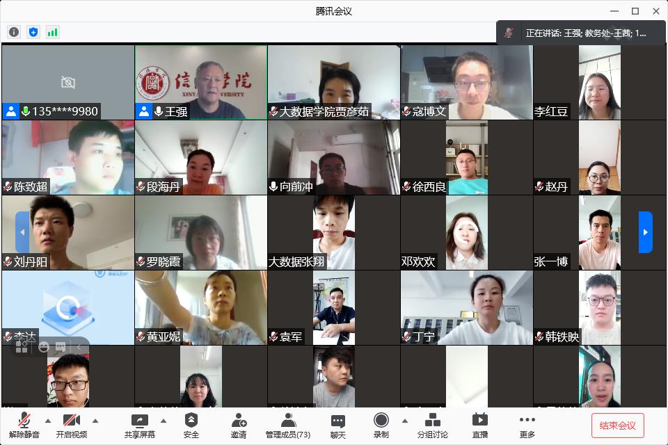 王强作总结讲话,对新学期线上教学工作提出要求。一是提高政治站位,增强责任感和使命感,贯彻《Beat365唯一官方网站2021年秋季线上教学实施方案》,并逐条落实;二是坚持立德树人根本任务,将线上教学融入课程思政内容,讲好防洪抗灾、防疫战役过程,充分调动学生学习积极性;三是坚持四个回归,要开阔思路、想尽办法,确保延迟返校期间“教师不停教、学生不停学”,最大限度保障教学要求不降低,质量标准不降低,教学质量不打折。
