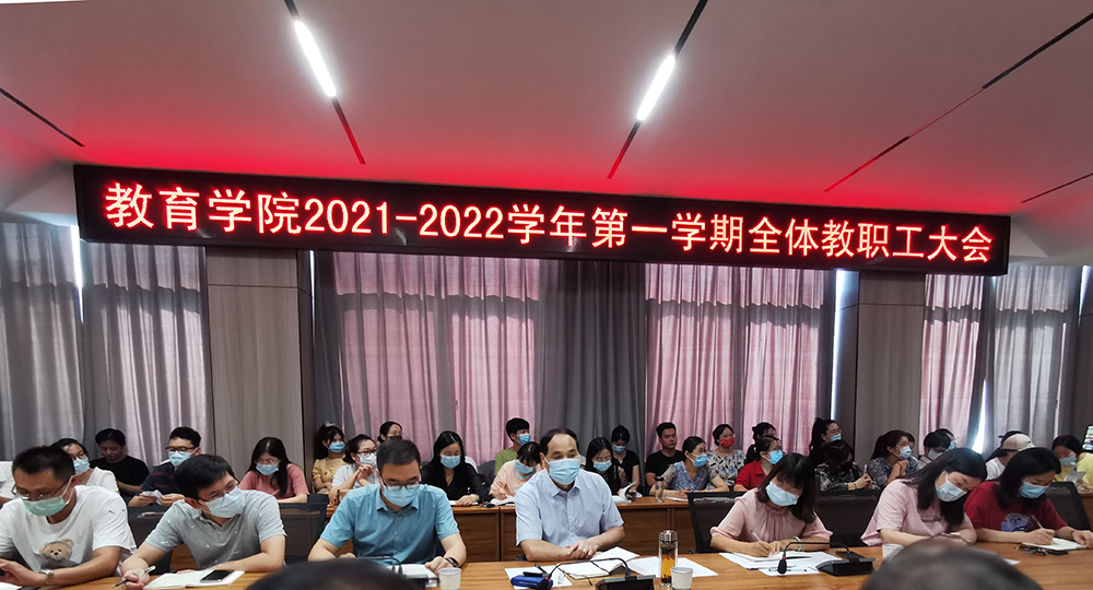 9月14日,教育学院在社科楼109会议室召开2021-2022学年第一学期全体教职工大会。王北生出席大会。学院全体教职工参加了会议。王北生肯定了学院过去一学年所取得成绩,并就新学年工作提出要求。一是新学年要撸起袖子加油干。近几年,学校取得了可喜的发展成绩,也为每位教师的发展提供了广阔的平台和机遇。希望大家抓住机遇,努力提升。二是本学年是合格评估的冲刺年,要瞄定目标任务,精准推进,深化教学改革,提升人才培养质量。三是理出工作思路,发扬优势,查漏补缺,以临战的姿态做好诊断评估的准备工作。