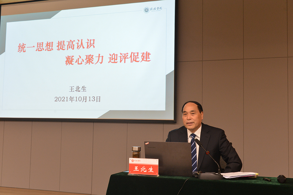 王北生以《统一思想 提高认识 凝心聚力 迎评促建》为题,从“学校的历史沿革及更名以来取得的重大成绩”“办学思路与定位”“顶层设计”“当前评估政策形势与下一时期的重点工作”“凝心聚力,共筑‘以校为家、爱校爱家’的精神家园”等方面,系统梳理了学校的历史进程和转设以来取得的重大发展成就,深刻解读了学校的办学定位、校训及“三风”、学校精神、办学信念等,客观分析了迎评工作所面临的严峻形势,进一步明确了学校今后一段时间的工作重点,并就“以校为家,爱校如家”话题与大家展开了深入探讨。