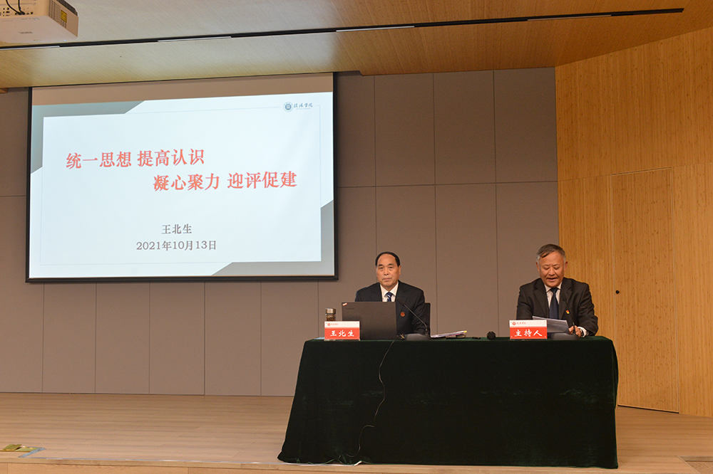 10月13日,学校“迎评六说”之校领导说学校发展活动在图书馆101报告厅举行,校长王北生作首场报告。理事长高云,党委书记褚金海,战略发展咨询委员会主任熊健民,专职副书记施昌海,副校长王志华、王强,工会主席傅洪涛,校长助理高雅、杨高伟、张永志出席报告会。全校中层干部参加了报告会。王强主持了报告会。全体辅导员在人文楼208会议室同步在线观看报告会直播。