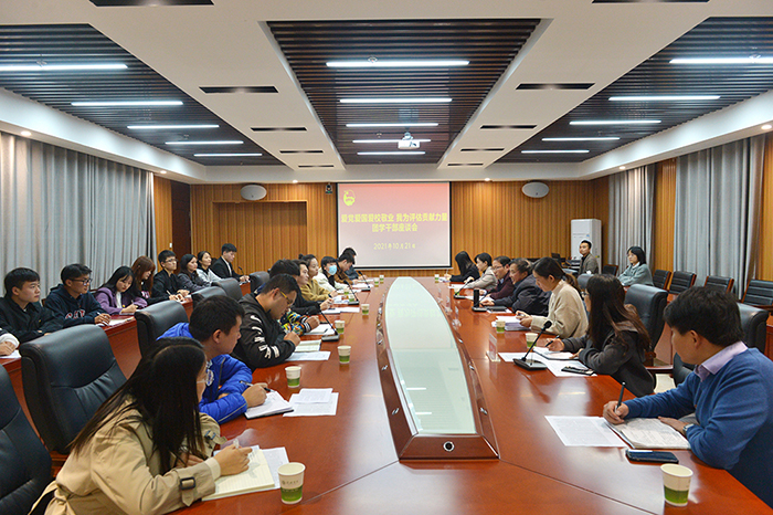 10月21日下午,校团委在综合楼1410会议室召开“爱党爱国爱校敬业,我为评估贡献力量”团学干部座谈会,推动评估“迎评六说”进班级。校党委专职副书记施昌海出席会议并讲话。宣传部、校团委、招生就业处等单位负责人李肖利、郑山峰、柳琳,各学院团总支书记及学生干部代表参加了座谈会。郑山峰主持了座谈会。