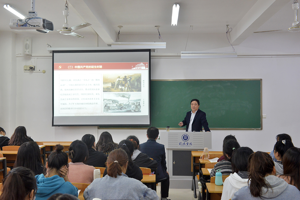 11月4日下午,校党委书记褚金海以“百年铸辉煌 远征再启航——深入学习贯彻习近平总书记在庆祝中国共产党成立100周年大会上的重要讲话精神”为题,为2020级汉语言文学本科9班和2020级地理科学本科2班的同学们上了一堂生动的思想政治理论课。党委办公室、马克思主义学院的相关负责人和部分青年教师聆听了本次授课。