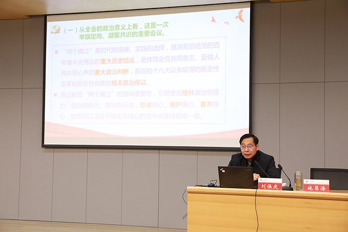 刘保庆以《解码六中全会的里程碑意义和深邃内涵》为题,从“党的十九届六中全会概览”“从四个维度认识六中全会的里程碑意义”“从七组数字解码六中全会的丰富内涵”等方面,运用大量数据、图片和视频资料,对全会精神实质和丰富内涵进行了深入解读和阐释。
