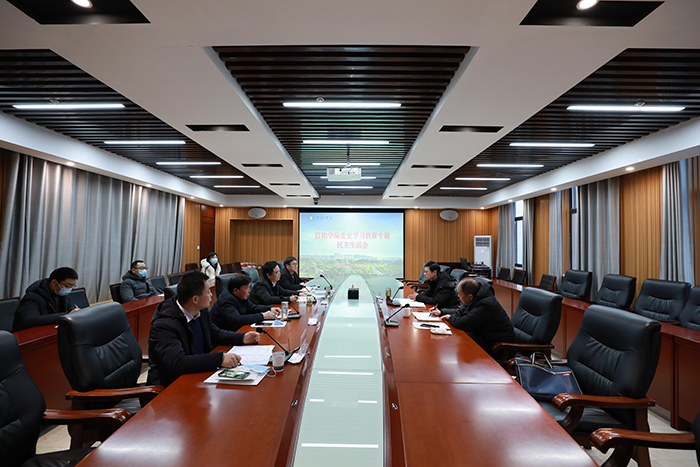 根据中央、省委、省委高校工委和市委关于开好党史学习教育专题民主生活会的安排部署,1月5日下午,学校党委在综合楼1410会议室召开领导班子党史学习教育专题民主生活会。市委宣传部党史学习教育巡回指导组副组长、市委宣传部四级调研员杨国刚,市委宣传部党史学习教育巡回指导组成员、信阳日报社机关党委专职副书记周海燕到会指导。校党委书记褚金海,专职副书记施昌海,纪委书记杨高伟,党委委员、校长助理张永志和全体校党委委员参加了会议。褚金海主持了会议。