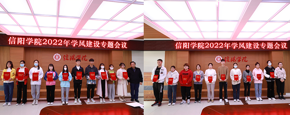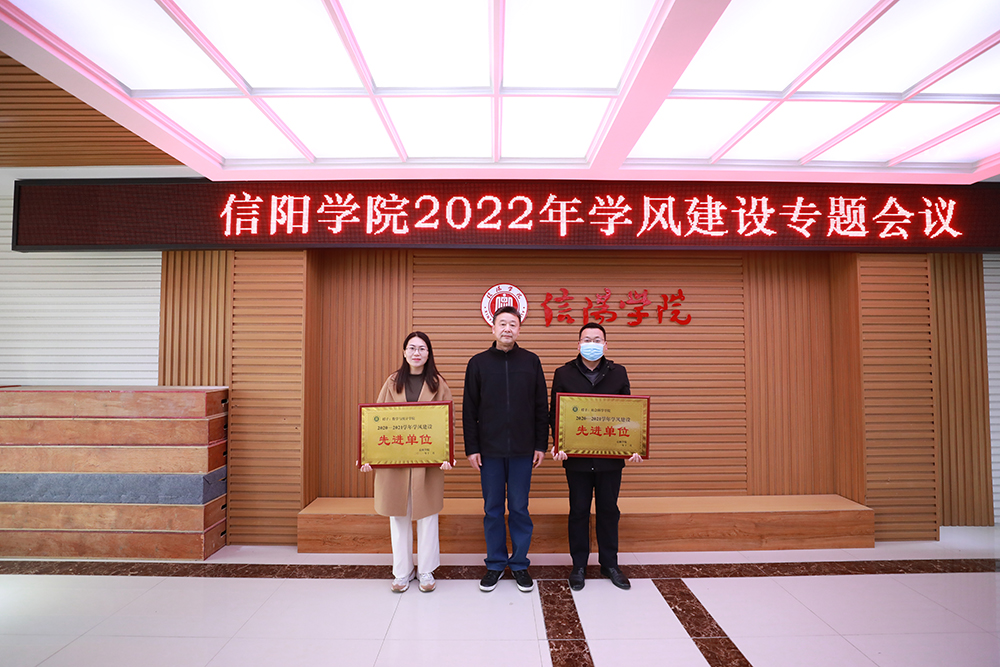 王志华和陈文涛、余婷婷为先进单位、优秀班级和优秀宿舍颁发了奖状和证书。对在2020-2021学年学风建设评选活动中取得表现突出的数学与统计学院、社会科学学院,2018级计算机科学与技术本科2班等30个班级和6号公寓楼304宿舍等106个宿舍进行表彰。