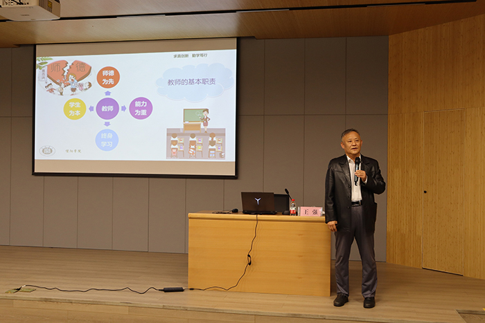 一是从师德为先、能力为重、学生为本、终身学习等方面阐述了“教师的基本职责”,良好的师德是从事教师职业的第一要求。二是从思想政治、道德、智商、情商、灵商、身体、心理等方面阐述了“教师的基本素质”。教师要有一个好身体,不能做纯粹燃烧自己的红烛,要充满热情、生机勃勃、温暖世界。三是从备课、教案、上课、作业布置与批改、课外辅导等方面讲述了“教师授课的环节和技巧”;“学术无禁区,课堂有纪律”,教师要掌控好课堂,保证教学效果。四是讲述“课程思政实施方法”,教师课程思政的基本任务是知识传授、价值引领、能力提升;以古今中外名师名家的具体案例,阐明如何正确看待和处理与社会的关系、与自然的关系、与科学的关系、与他人的关系等。五是讲述了合格教师、教书匠和教育家的区别,鼓励青年教师从合格教师做起,树立教育家的情怀和目标,做好教书匠的业务。最后,王强用一句话勉励教师们:“在阳光中生活,在自信中成长,静下心来教书,潜下心来育人。”