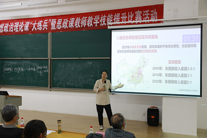 青年教师薛明达讲解否定之否定规律,引导学生辩证看待人生道路曲折性与前进性的统一;杨宁从国家民生工作的相关举措入手,说明了党全心全意为人民服务的根本宗旨;封宇声情并茂地解读了北京冬奥会等时事热点,引导学生树立以爱国主义为核心的民族精神;程前从不同的人生态度走向的不同人生道路出发,鼓励学生树立积极进取的人生态度;郑远解读了人生目的、态度和价值三要素,引导学生树立正确的人生观;陈红莉对伟大建党精神的内涵进行了深刻解读;陈立新运用雨课堂,以做大蛋糕重要还是分好蛋糕的问题为切入点,导入教学主题——以高质量发展推动共同富裕;张玉柯引用周总理的历史事迹、学校校友的鲜活事迹,呼吁广大学子为实现中国梦注入青春能量。