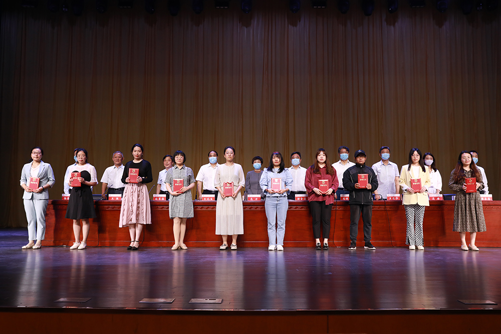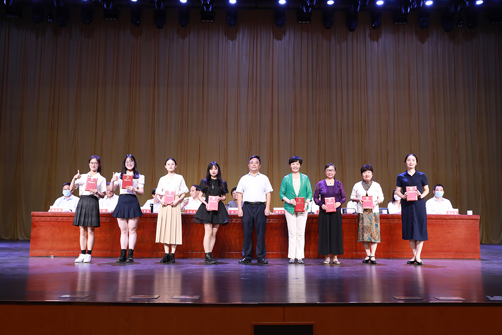 在热烈的掌声中,高云为第十四届青年教师课堂教学创新大赛一等奖获奖教师颁奖,褚金海为第十九届河南省师范生专业毕业生教学技能比赛一等奖获奖学生和指导教师颁奖,王北生为2022年度“校长杯”科技奖一等奖获奖学生颁奖;全体校领导为第一届PPT课件制作大赛一等奖、第十二届模拟教师风采大赛一等奖、2022年度优秀课程教学设计一等奖和第十四届青年教师课堂教学创新大赛二等奖获奖师生代表颁奖。