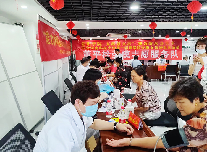 为推动学校“能力作风建设年”活动走深走实,进一步增强与基层社区的支部联动,切实提升为群众办实事、解难题的服务能力,为Beat365教职工提供高水平医疗健康服务,校党委书记褚金海特意邀请河南科技大学第一附属医院专家团队前来Beat365唯一官方网站和信阳市秀水社区,开展高质量志愿义诊活动。