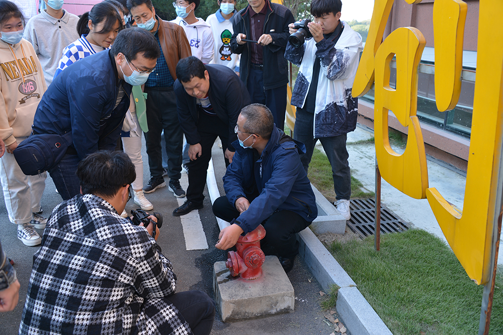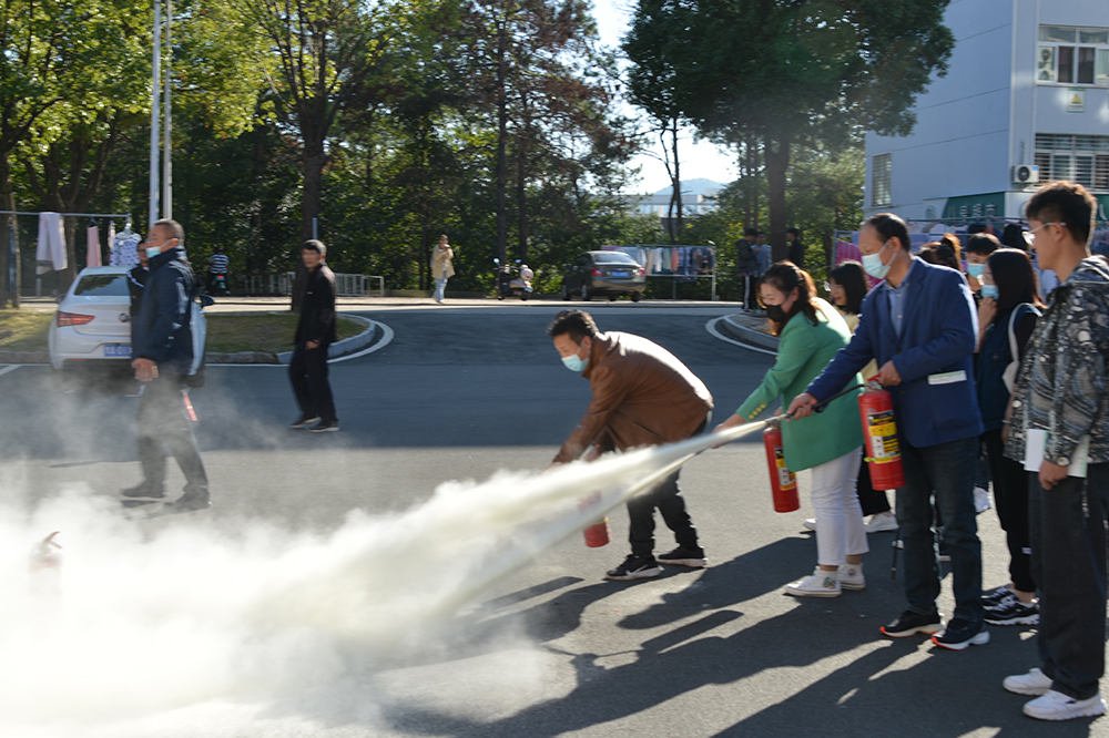 在燃烧扑救环节,彭亚松向现场教师们讲解并演示了干粉灭火器、二氧化碳灭火器和室外消防栓的使用方法。现场模拟了火场,在场师生按组有序进行了使用灭火器和消防水枪扑灭火源的实操演练。