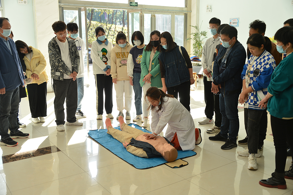 在心肺复苏环节,校医院易顺梅先讲解了机械创伤的急救步骤和操作手法,并就心肺复苏应急急救操作进行了介绍、现场演示及互动体验。