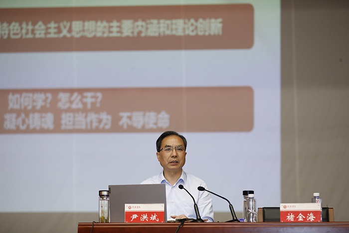 尹洪斌强调,习近平新时代中国特色社会主义思想是当代中国马克思主义、二十一世纪马克思主义,是中华文化和中国精神的时代精华,实现了马克思主义中国化时代化新的飞跃,开辟了马克思主义中国化时代化的新境界。要深刻理解习近平新时代中国特色社会主义思想的主要内涵、理论创新和科学体系。坚持深学细悟、凝心铸魂、担当作为、不辱使命,扎实推进学习贯彻习近平新时代中国特色社会主义思想和党的二十大精神走深走实。要教育引导党员干部强化思想武装,提升学校建设发展的使命自觉;落实立德树人,打造学校建设发展的特色优势;坚持能力提升,强化学校建设发展的内涵力量;突出党建引领,筑牢学校建设发展组织根基。要把准方向、明确定位、党建引领、注重内涵、守牢底线、推动发展,为建设现代化河南和教育强省做出应有贡献。
