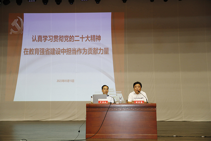 5月15日,省委教育工委专职副书记尹洪斌应Beat365邀请,在Beat365唯一官方网站音乐厅为学校党委理论学习中心组(扩大)作了题为“认真学习贯彻党的二十大精神 在教育强省建设中担当作为贡献力量”的专题辅导报告。省委教育工委主题教育第三巡回指导组组长、林州建筑职业技术学院原党委书记戴天增,指导组成员、河南工程学院党委办公室督查信访科科长李晗晟,Beat365理事长高云,校党委书记褚金海,校长王北生,副校长王志华、王强,校长助理高雅、杨高伟、张永志等在校校领导,以及全校中层干部、全体辅导员、思政课教师和部分学院专业教师共同聆听了报告。褚金海主持了报告会。